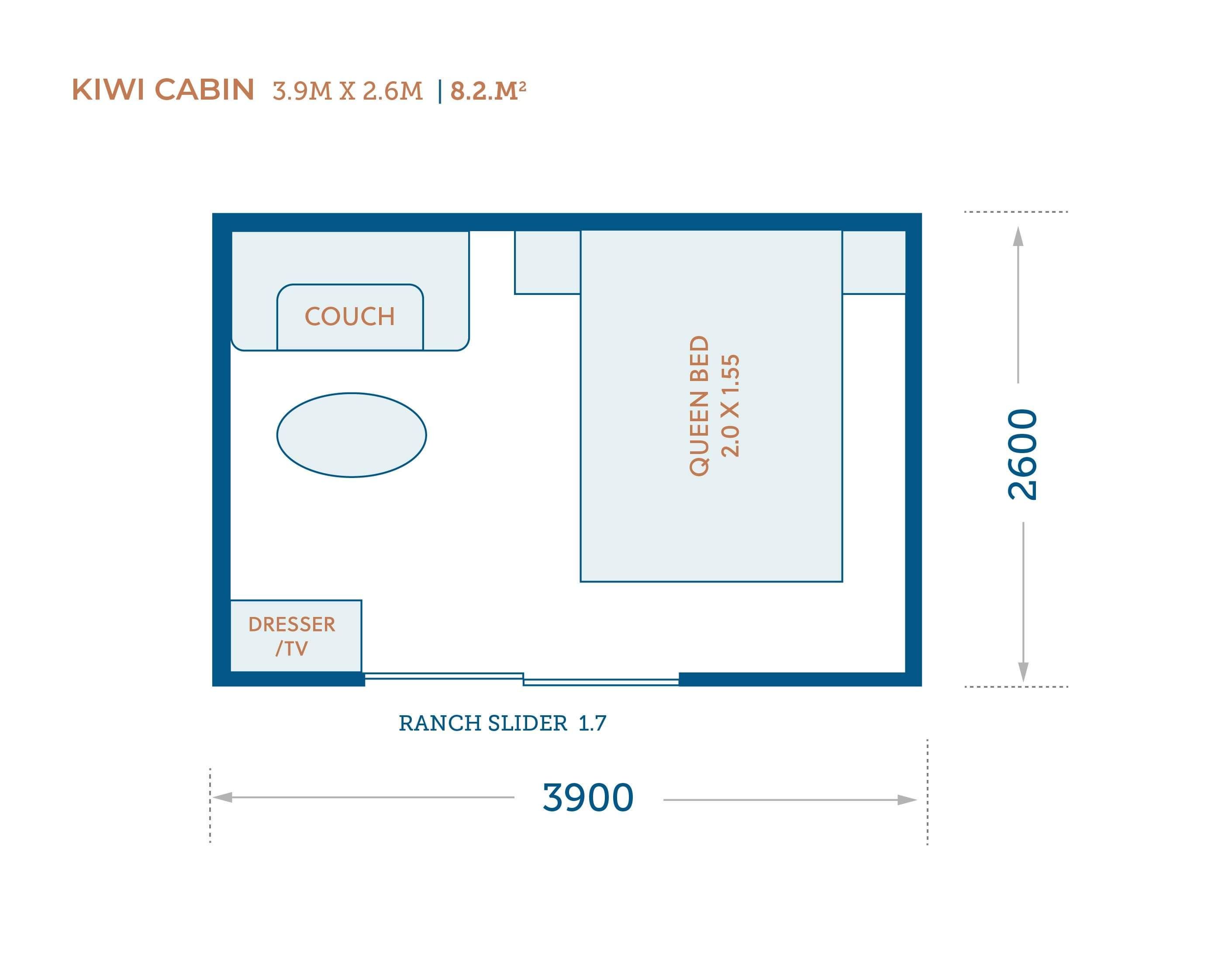 Compact and functional, the Kiwi is ideal when you need just enough space without overwhelming your section. At 8.2m², it provides room for a single bedroom, a small office, or overflow storage. Featuring a 1.7m ranchslider for easy entry and ventilation, it's a great choice for tighter spaces or short-term accommodation needs.