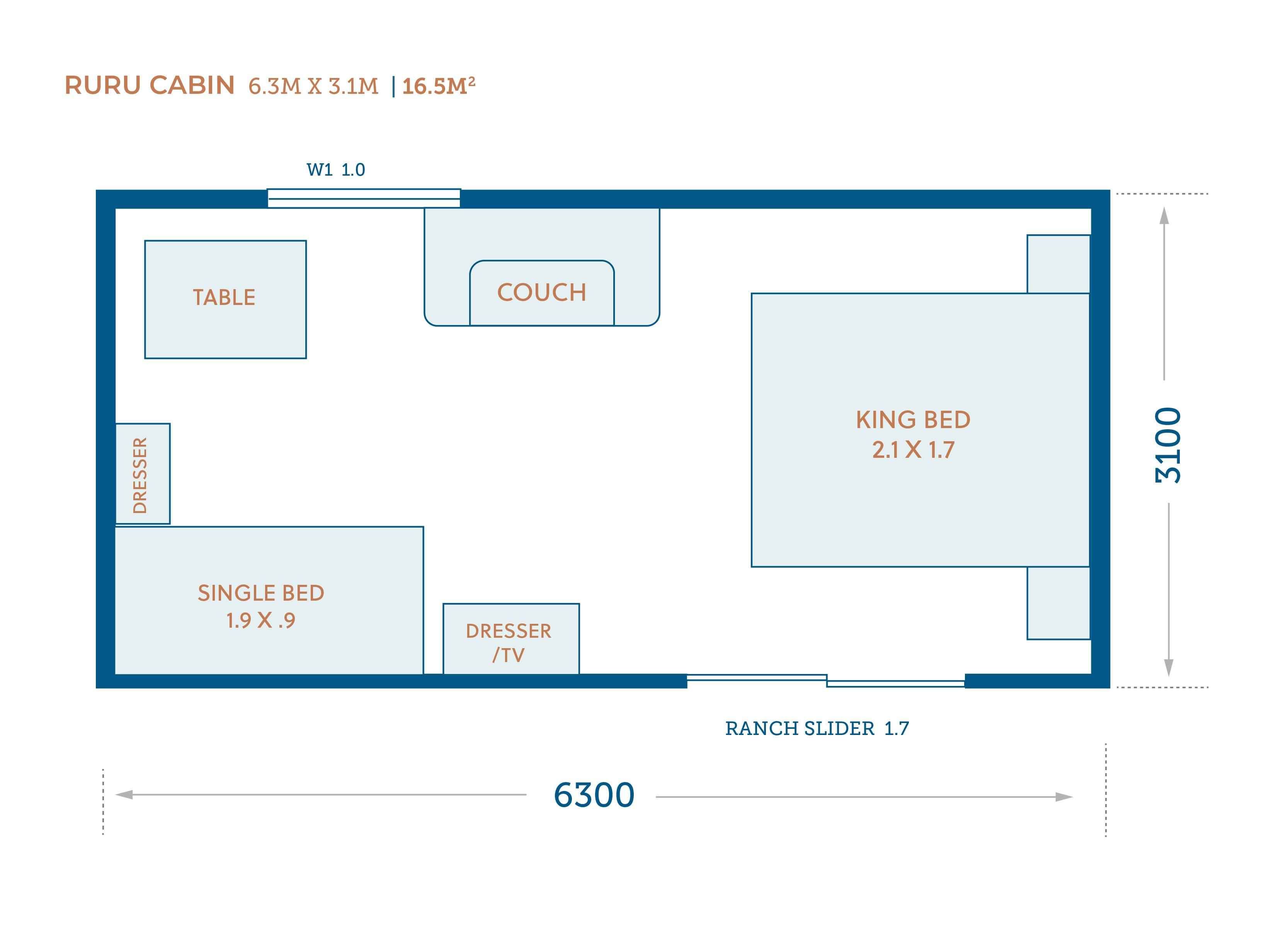 The Ruru is the largest cabin in the range and delivers generous space for a variety of uses — from a more spacious sleepout or studio to a larger office setup. With 16.5m² of interior area, this cabin features a 1m x 1m window and a 1.7m ranchslider, creating a bright, open feel. Perfect for those needing maximum room without committing to a permanent build.